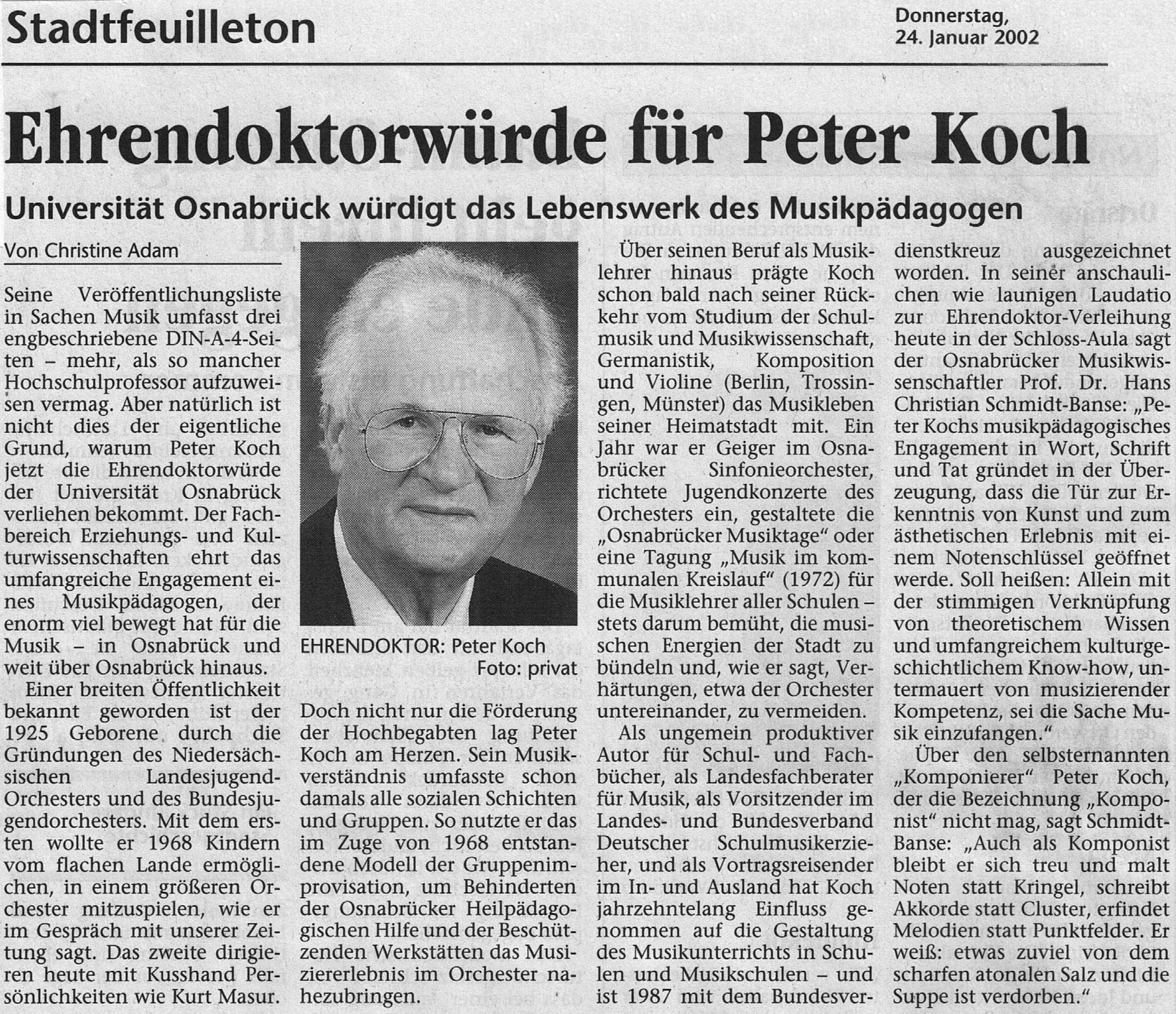 Auf Vorschlag der Facheinheit Musik / Musikwissenschaft verlieh der Fachbereich Erziehungs- und Kulturwissenschaft am 24.01.2002 Herrn StD i.R. Peter Koch (*07.10.1925 - † 20.11.2012) aus Osnabrück für seine außergewöhnlichen musikpädagogischen Verdienste den Grad und die Würde eines Doktors der Philosophie ehrenhalber.